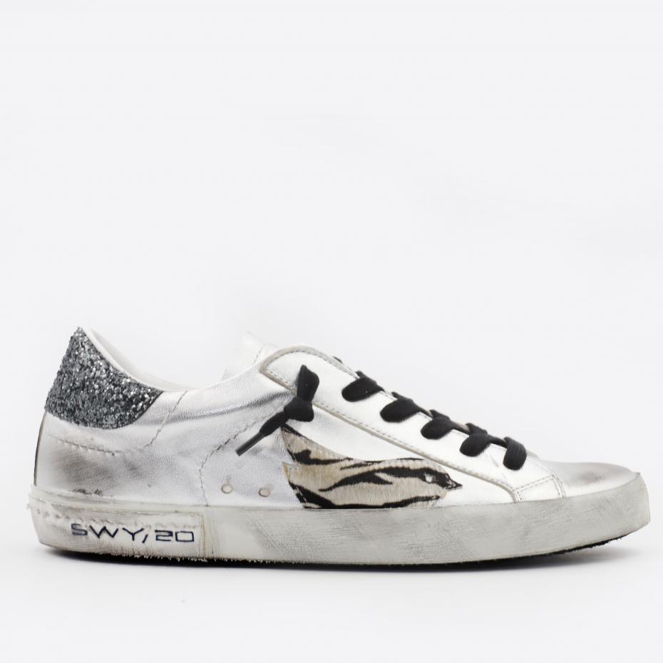 Lo stile vintage intrecciato con il luxury dà origine a questa calzatura iconica. La sneaker Winner in laminato argento, è caratterizzata dall'uccellino pony zebrato. Talloncino glitter nero e lacci neri.
